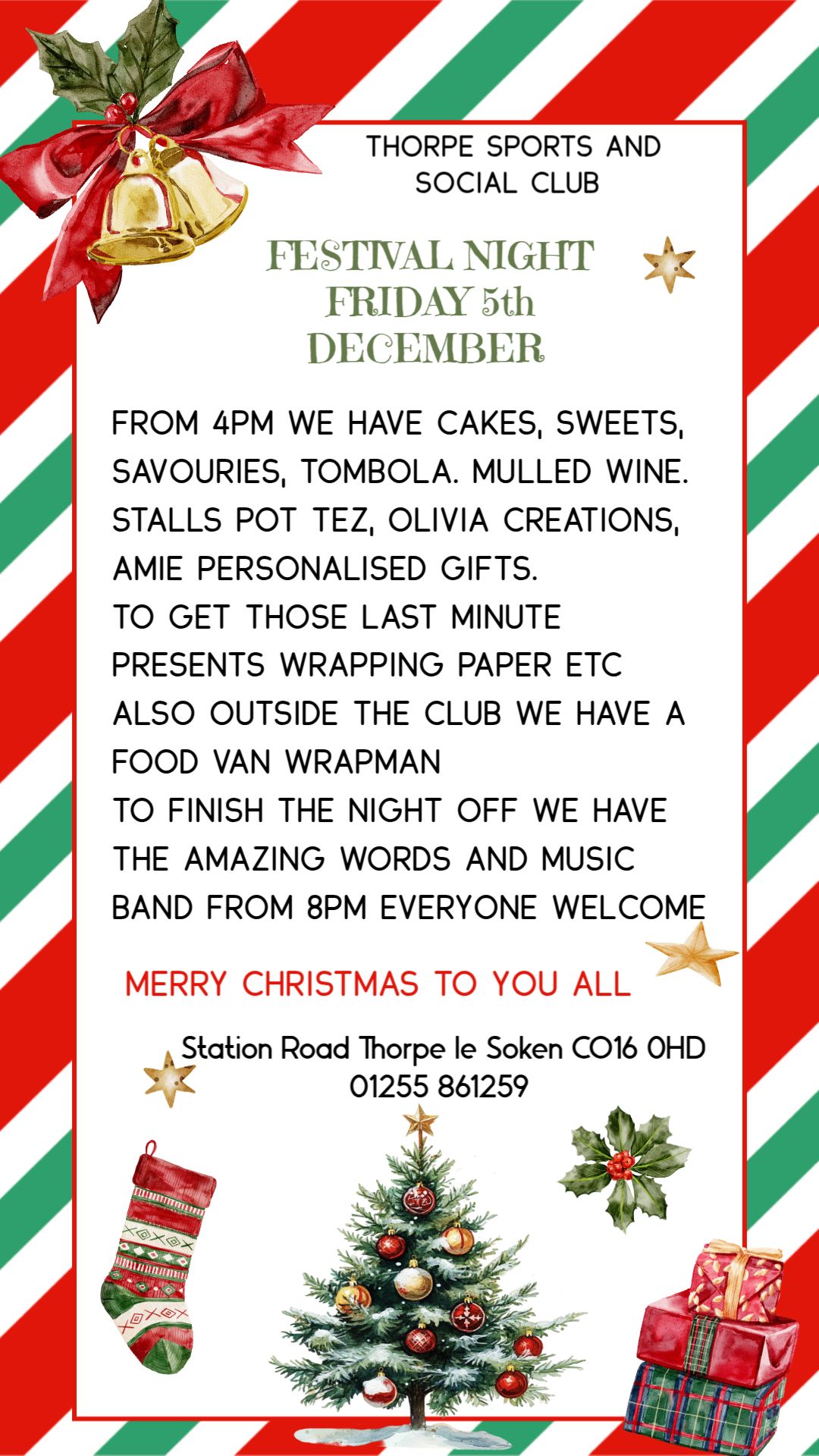 Join us for aΒ Festival Night at Thorpe Sports & Social Club! on Friday 5th December!