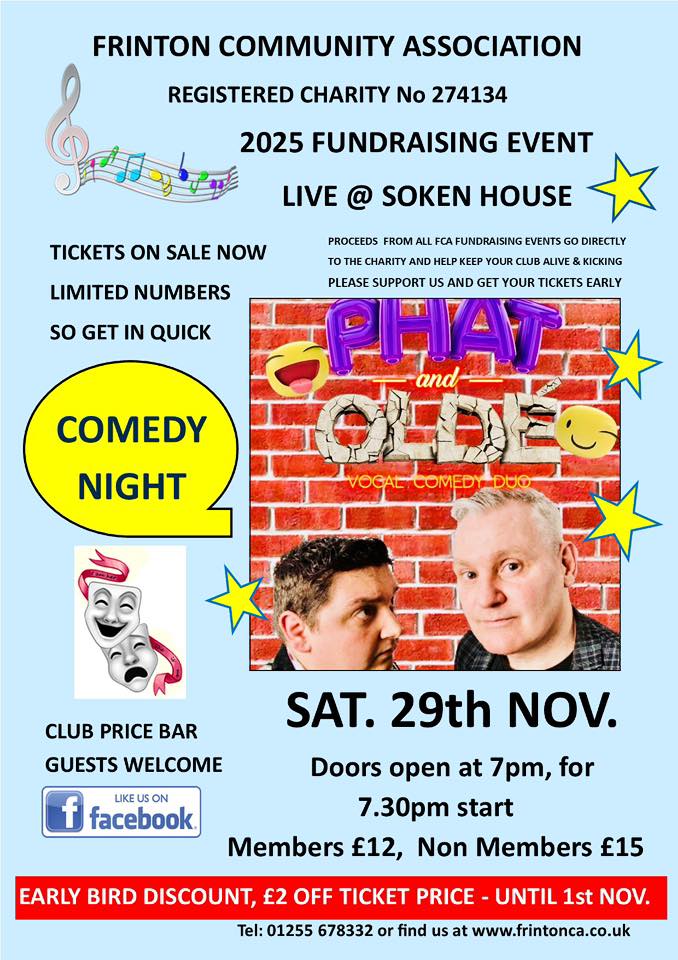 ๐ Get ready for a night of non-stop laughter at Soken House, as the Frinton Community Association presents Phat & Olde โ The Vocal Comedy Duo! ๐ค๐ถ