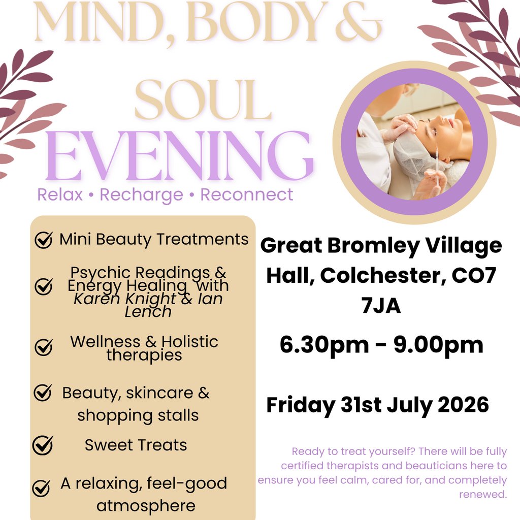 🎉Mind, Body & Soul is coming to Great Bromley Village Hall, Colchester! Happening on 2026-07-31, this exciting other event brings top entertainment to the heart of Colchester and the wider Tendring and Essex area — including Clacton-on-Sea, Harwich, Brightlingsea, and Mersea Island.